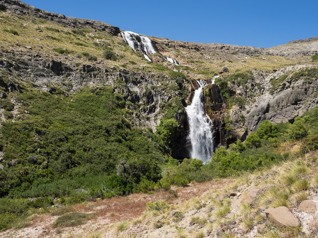 The bus leaves the tarmac half an hour after Molina. We drive past empty fields and huge pine plantations. Then we descend up Rio Claro valley (Apparently the Spanish were not very creative with their river names...). There are a lot of campgrounds, the area seems to be very popular with chilean tourists. After passing Radal the road climbs steeply before I leave the bus at Parque Nacional Siete Tazas.