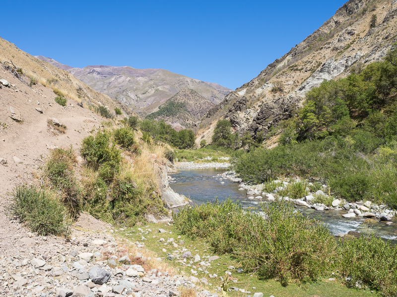 I cross the Rio Las Truchas near another puesto and soon after the river descends in a gorge. I hike on a good trail above the Rio. For the first time the snow capped silhouette of Volcan Nevado Chillan comes into view, my next destination!