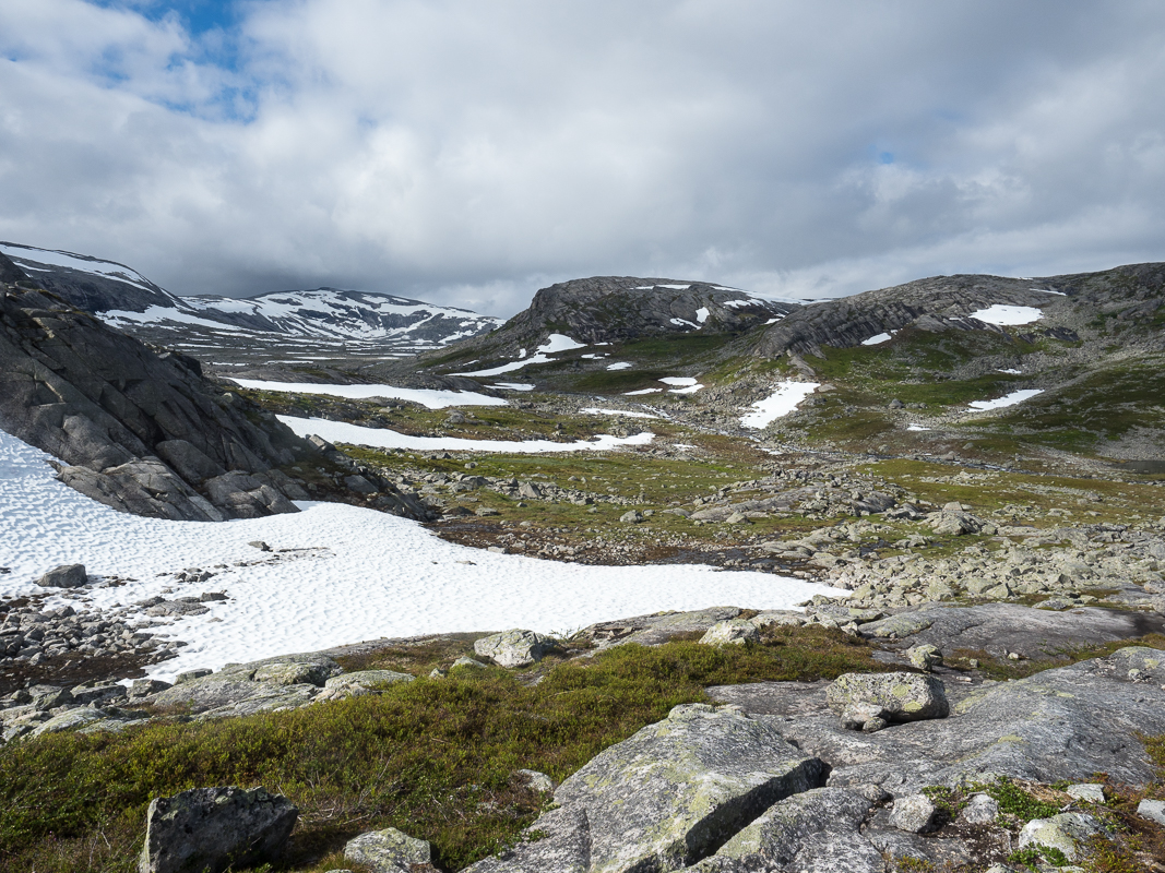 The trail changes the side of the border here frequently and a long descent down a snowy valley gets me again into a greener landscape.