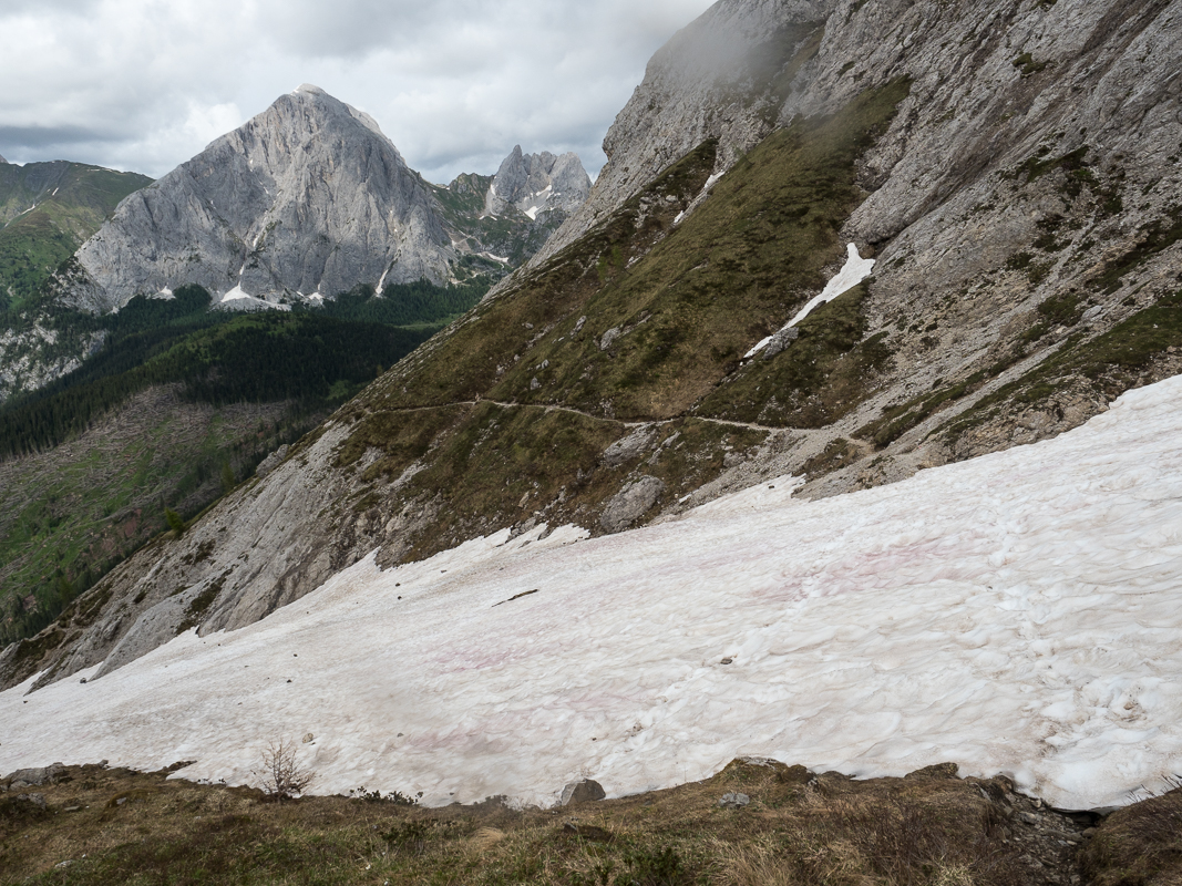 Dann erfolgt der Aufstieg zum Pass Sella Franza auf ca. 2150 m. Zwar gibt es auch hier noch viele Schneefelder, das Terrain ist aber weniger steil.