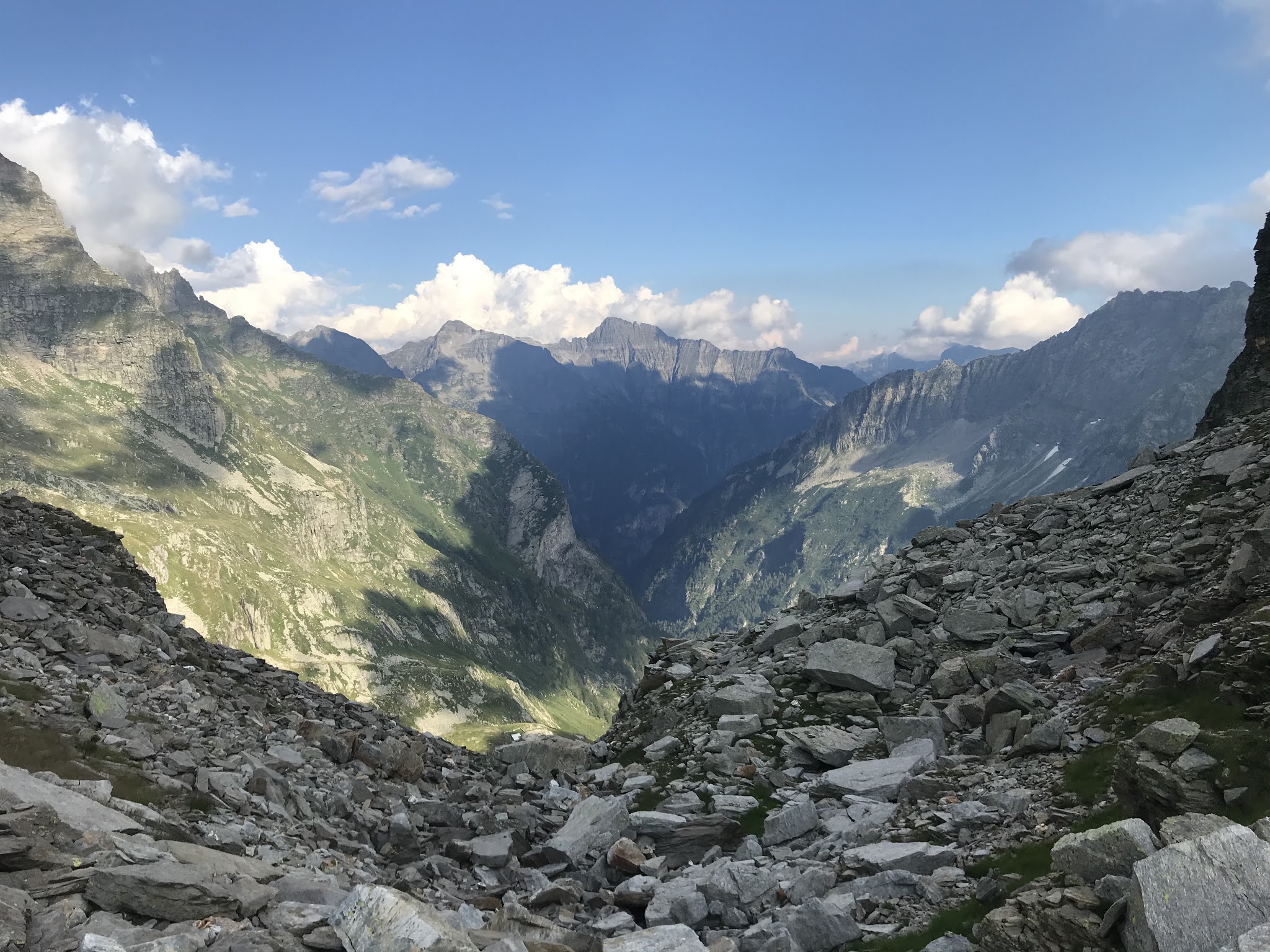 Am nächsten Tag geht es über Granitblockfelder hoch zu zwei Pässen, bei denen der Abstieg jeweils ziemlich steil ist. Die Alta Via della Maggia ist zwar weniger technisch als die Verzasca Route, aber durchaus anspruchsvoll und anstrengend, mit sehr vielen Höhenmetern.