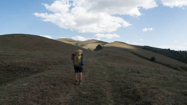 Nach einer milden Nacht bricht ein weiterer sonniger Tag an und wir laufen schon bald wieder in T-Shirts und kurzen Hosen. Wir wandern weiter aufwärts zu einem Kamm, wo einige Schäferhütten bereits verlassen sind. Sollte die Weidesaison jetzt, Mitte September schon zu Ende sein?