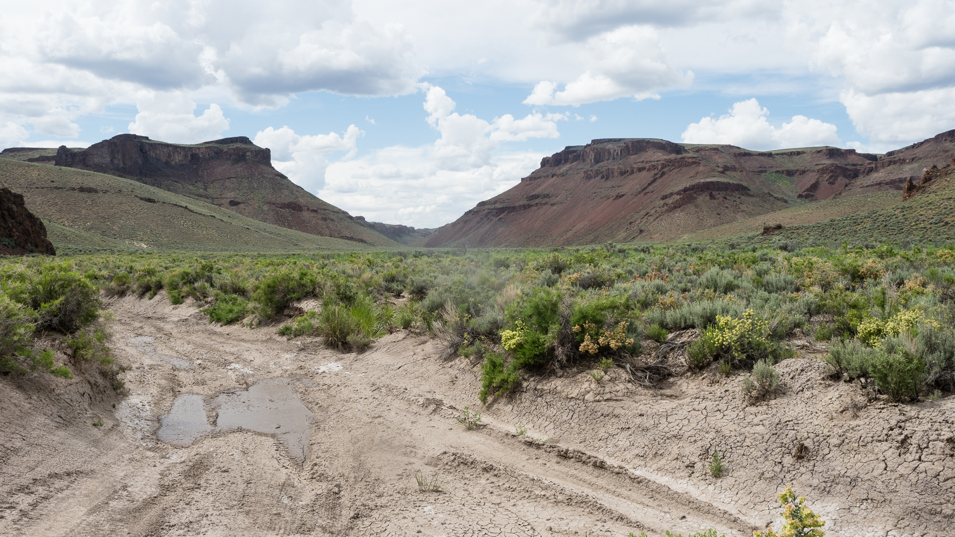 In der Nacht schlafe ich lange und gut, daher geht es mir am Morgen besser und ich habe kein Fieber mehr. Wir folgen Mudflat Wash weiter, wo immer wieder Wasser steht, und es von Mücken wimmelt. Der Strauchbewuchs ist stellenweise dicht und hoch, es gibt aber auch grüne Wiesen. Vom Steilufer des Trockenbetts aus sehen wir einen Mustang, mit hellem Nacken und ansonsten bräunlicher Farbe auf einer üppigen Weidefläche stehen, der langsam auf uns zuzieht, als er uns bemerkt. Auch dieses Wildpferd weiß offenbar wenig mit Menschen anzufangen. Wir sehen einen riesigen Ochsenfrosch am Ufer und einmal ziehen wir sogar die Schuhe aus um ein Stück barfuß durchs Wasser zu laufen. Es gibt hier nirgendwo Fahrspuren, eine tolle Einsamkeit!