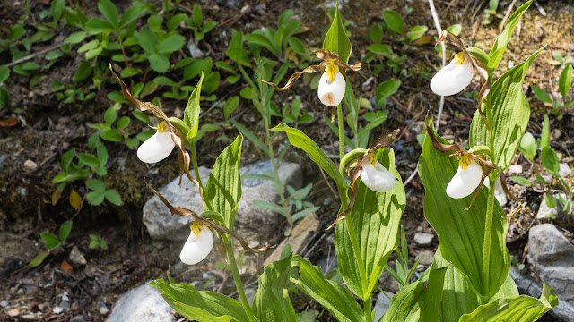 Anschließend geht es bergab in eine bewaldete Schüssel bevor wir wieder aufsteigen. Manchmal sehen wir orange Bänder, die den Wegeverlauf markieren, das Zwiebelgewächs von dem wir schon in Waterton gekostet hatten, ist inzwischen stellenweise bereits aufgeblüht, Massen von Schmetterlingen laben sich an feuchten Stellen und alten Kothaufen und wir genießen die Waldeinsamkeit bei dem schönen Wetter. Am malerisch unter einer Felsmauer liegenden Window Lake gibt es einen Zeltplatz, den man umsonst benutzen darf. Hier treffen wir ein Paar mit ihrem Hund, die zwei entspannte Tage am See verbringen. Über eine Blockhalde gelangen wir dann zu einem Pass über dem See. Das ist dann auch das Muster des ganzen Nachmittags: Lange Zeit wandern wir nach oben, bis knapp über der Baumgrenze, dann geht es wieder weit in den Wald nach unten. Das wiederholt sich drei Mal, so dass es nicht verwunderlich ist, dass wir am Ende des Tages 1659 Höhenmeter zurückgelegt haben! Glücklicherweise verlaufen die neu angelegten Pfadabschnitte meist über weit geschwungenen Serpentinen, so dass die Auf- und Abstiege ganz gut zu bewältigen sind. Während der Wald in den tieferen Lagen einen sehr dichten Unterwuchs aufweist, wird er je höher man gelangt um so besser begehbar.