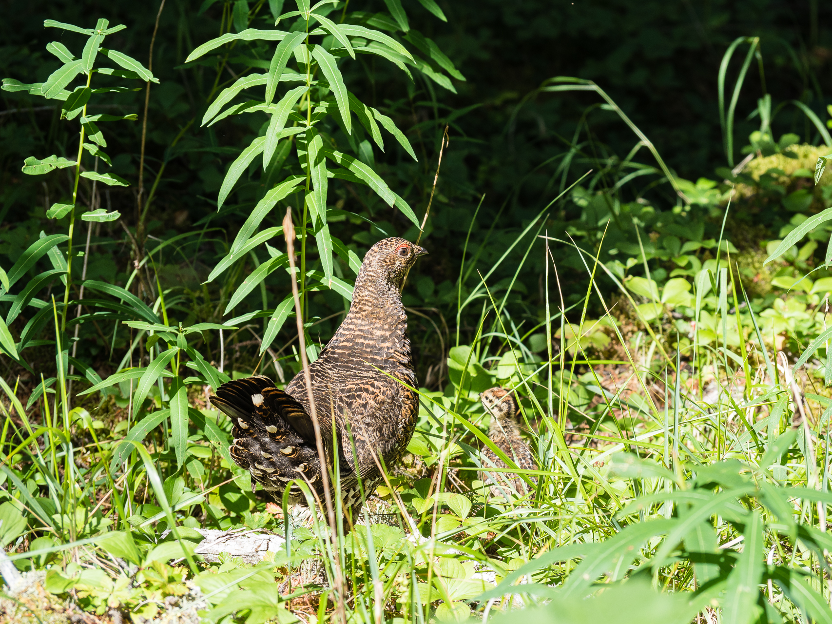 Obwohl wir den ganzem Tag dem Fluss folgen, ist die Strecke sehr abwechslungsreich. Mal geht es durch hohen, dichten, dunklen Fichtenwald mit dicken Baumstämmen, mal zwängen wir uns durch zugewachsene Weidendickichte, was jetzt, wo es trocken ist, aber uns viel angenehmer erscheint. Immer wieder erhalten wir Aussichten über den Fluss und gelangen auch kurz auf die offene Schotterebene, wo sich der Fluss verbreitert. Meist ist die Wegführung ziemlich flach und der Wald streckenweise moosig und trocken. Immer wieder müssen wir reissende Nebenbäche durchqueren, meist in dem wir sie mit Schuhen durchwaten. Einmal balancieren wir aber auch über einen schmalen Baumstamm. Wir sehen einige Male Waldhühner, darunter auch eine Henne mit süßen Küken. Ein Stachelschwein klettert auf einen Baum um sich vor uns in Sicherheit zu bringen und hinter der Fensterverkleidung einer neuen Blockhütte entdecken wir eine kleine Fledermaus.