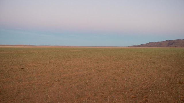 Erst um 15:30 Uhr laufe ich weiter. Es gibt jetzt kaum noch Schatten spendende Akazien, als ich dann doch noch auf eine stoße, lege ich eine Pause ein. Sogar etwas grünes Gras wächst hier. Irgendwann steige ich über den Zaun und wandere querfeldein, was mir viel besser gefällt als auf der Piste zu laufen. Die Landschaft ist grandios: Zu meiner linken laufen die roten Dünen der Namib in schwarze Berge hinein, rechts ragen die schokobraunen Tirasberge steil auf. Um 18:30 Uhr ist es schon dämmrig und als ich an eine große Akazie gelange, schlage ich mein Cowboylager auf und koche dann Nudeln auf meinem Hobokocher, während der 3/4 Mond erscheint und die Sonne farbenprächtig verschwindet. Es ist herrlich endlich wieder unterwegs zu sein, besonders in dieser atemberaubend schönen, einsamen Landschaft!