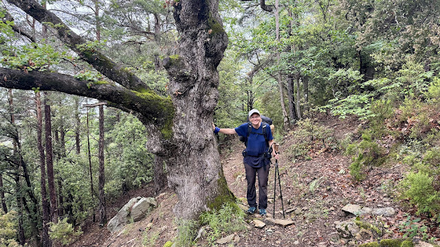 In der Nacht regnet es zu unserer Überraschung einige Tropfen und am Morgen ist die Landschaft in Nebel gehüllt, und das am Mittelmeer! Dennoch ist die Vegetation trocken. Wir folgen dem felsigen Grat weiter und steigen dann von 765 bis auf 365 m am Col de Banyuls ab, bevor es wieder bis auf knapp 1000 m am Pic de Salfort geht. Hier erwartet uns eine komplett andere Landschaft mit Weiden voller brauner Kühe. Einmal verlassen wir den Kamm und wandern durch schönen Buchenwald, der uns stark an Zuhause erinnert. Zurück am Kamm wird es sehr düster und bald beginnt ein Gewitter, das wir unter der Zeltplane an einen Felsen angelehnt, halbwegs trocken überstehen. Danach hat der Wind den Nebel weggeblasen und wir können Sonne und blauen Himmel genießen. Jetzt sehen wir auch die höheren Berge der Pyrenäen. Ein toller Vorgeschmack auf die kommenden Wochen!