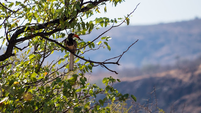 Etwas später lege ich lediglich eine Dreiviertel Stunde Mittagspause ein, bei der ich Nüsse vom Damaraland Camp esse. Nachmittags verläuft die Route meist im Tal, das jetzt deutlich dichter bewachsen ist. Neben gelbem Gras, sprießen auch einige grüne Halme. Links ragt stets die Bergmauer mit gewaltigen Tafelbergen auf. Überall sind jetzt Wildspuren zu sehen und tatsächlich rechne ich stets mit einer Begegnung. Zweimal beobachte ich Zebras. Mit der einen Gruppe flüchten sogar 9 Springböcke. Eine Giraffe die Mopane Blätter frisst, bemerkt mich zunächst nicht, so das ich sie in Ruhe fotografieren kann. Natürlich sehe ich auch Vögel, wie Hornvögel mit rotem Schnabel und die kleinen Papageien, die ich schon aus der Naukluft kenne.