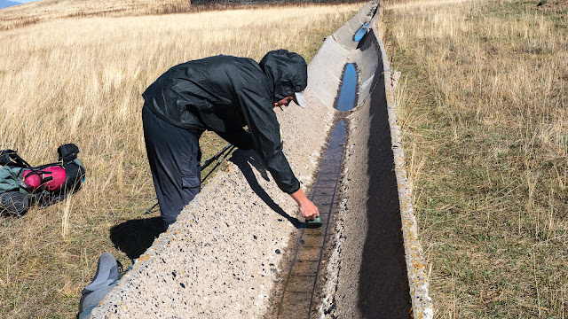 Am nächsten Tag folgen wir nur ungefähr der Route des TCT. An vielen Stellen bieten sich weglose Abkürzungen an. Heute passieren wir zahlreiche Bäche und Quellen und folgen sogar einem langen Tal mit feuchten Wiesen, wo wir den Bach zweimal barfuß durchwaten. Einmal hält ein fetter Geländewagen mit zwei Männern bei uns, die gut gelaunt sind und lediglich eine Spritztour zu unternehmen scheinen. Der kleine Ort Karadzi wirkt größtenteils verfallen, dennoch verbergen sich hier Kartoffelfelder hinter Steinmauern. Zweimal hält ein Auto bei uns und der Fahrer fragt jeweils, ob er uns mitnehmen kann. Unser Lager schlagen wir auf lediglich 2320 Meter Höhe auf. Es ist hier viel milder, daher sind wir auch den ganzen Tag in T-Shirt und kurzer Hose gelaufen.