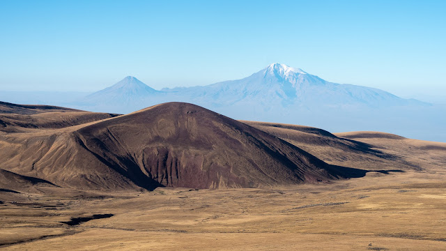 Selbst im Wassersack ist die Flüssigkeit morgens gefroren und wir warten, bis die Sonne unser Zelt erreicht, bevor wir um 8 Uhr los gehen. Am See liegt ein Boot und auf der anderen Seeseite stehen einige Hütten. Zwischen den Vulkanen hindurch steigen wir heute fast die ganze Zeit weglos weiter aufwärts, was aber in dem Terrain, mit kurzem, gelbem Gras kein Problem darstellt. Als wir für unsere Mittagsrast ein windgeschütztes Plätzchen finden, ist es fast angenehm warm. Neben dem Aragats können wir jetzt manchmal auch den Blick zum 5137 Meter hohen Vulkan Ararat, unmittelbar an der türkischen Grenze schweifen lassen. Schließlich erreichen wir einen Pass, an dem wir unsere Rucksäcke verstecken und dann zum Rand des 3597 Meter hohen Kraters des Vulkan Azhdahak aufsteigen. Der Kraterboden, wird von einem klaren, grünen See bedeckt. Wir umrunden den Krater, wobei wir durchgehend spektakuläre Aussichten über die Vulkanlandschaft genießen. Sicher einer der Höhepunkte unserer Zeit im Kaukasus! Schließlich steigen wir wieder ab, wobei wir ausgedehnte Blockfelder weitgehend umgehen können.