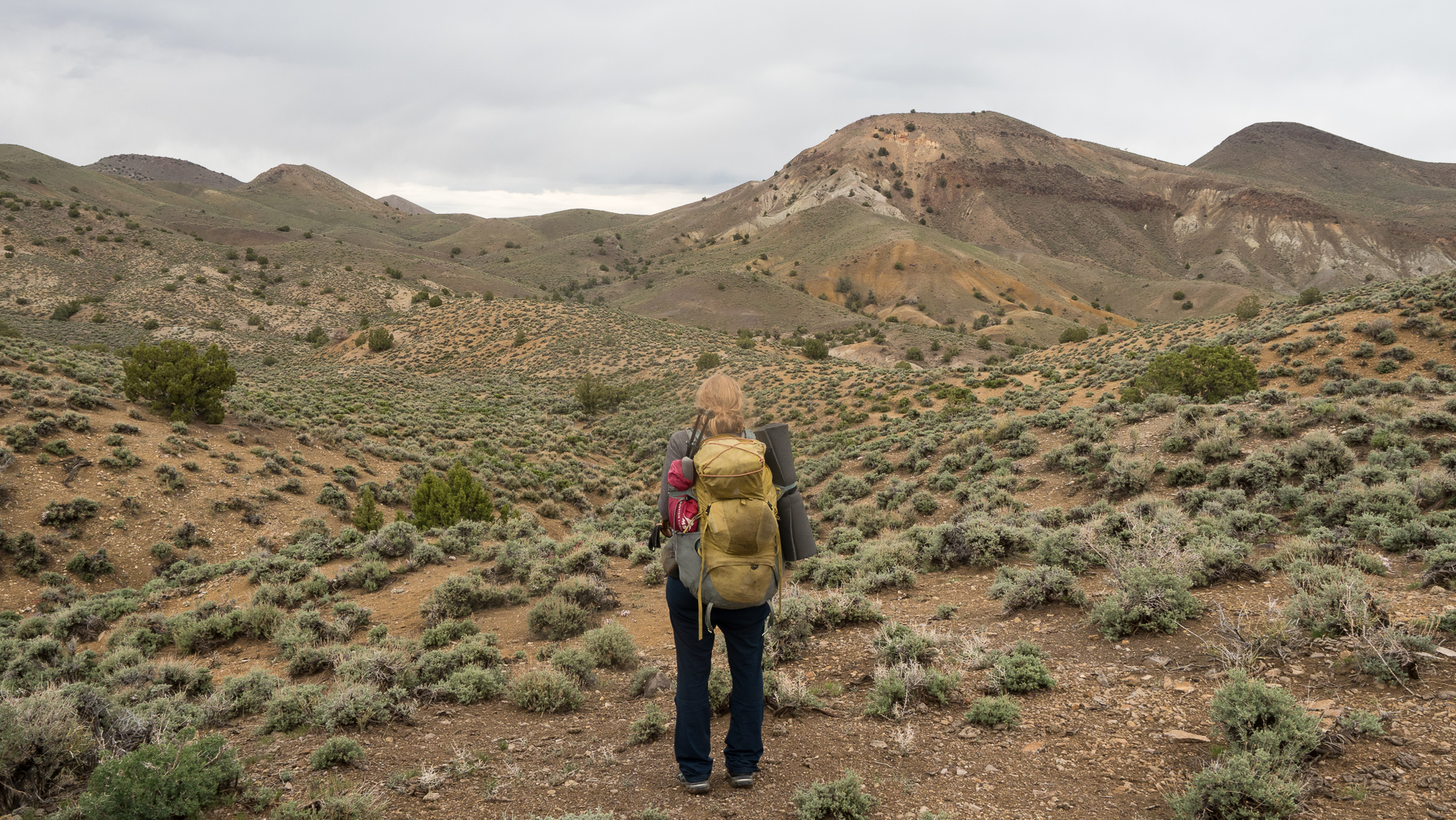 Am nächsten Morgen regnet es einige Tropfen, dennoch sind wir schon bald wieder im Canyon, der sich als steil und schwierig entpuppt. Zwei Stufen müssen erklettert werden und eine weitere können wir nur bewältigen, indem wir sie umgehen. Einmal stoßen wir auf die Überreste dreier Wildschafe. Ob sie wohl von einer Flashflood überrascht wurden? Stellenweise fließt der Bach in der Schlucht und es gibt regelrechte Weidendickichte, außerdem dichten Kiefern- Wacholder Wald. An einer Steilwand führt sich ein Kolkrabenpaar ziemlich aufgeregt auf, wahrscheinlich haben sie dort ihr Nest. Schließlich gelangen wir aus dem Vulkangestein heraus und die Schlucht wird offener, mit vielen schönen Blumen, in weißer, gelber und roter Farbe. Wir gelangen auf einen Pass, von dem aus wir zurück zur Goldmine blicken können. Der Abstieg ist flacher und führt uns wieder in den Wald. Wir sehen entfernt einige Kühe, hören Maultiere und sehen eine pechschwarze Eidechse, die an einen Alpensalamander erinnert. Schließlich überqueren wir einen weiteren Pass, hinter dem wir zahlreiche umgestürzte Bäume überwinden müssen. Überall gibt es Kuhspuren, kein Wunder, da wir an einer Stelle wieder auf fließendes Wasser stoßen. Als wir den dritten Pass überqueren ist es bereits ziemlich windig und einige Tropfen fallen aus dem grauen Himmel. Wir gelangen in ein weites Sagebrush Tal, wo dunkle Wolken darauf hinweisen, dass bald ein Gewitter aufziehen könnte. Daher schlagen wir um 14 Uhr Anke’s Zelt auf. Das entpuppt sich als gute Entscheidung, da sich das Unwetter tatsächlich über uns entlädt und recht viel Regen fallen lässt. Nach zwei Stunden klart es auf und wir wandern in der angenehm frischen Luft unter einem immer noch bewölkten Himmel weiter. Wir kürzen einen Bogen des Desert Trail ab und wandern durch offene Hügel zum Kamm der Gabb’s Valley Range, dem wir weiter aufwärts folgen. Entfernt sehen wir drei Pferde und bewältigen etliche Steigungen, während wir tolle Aussichten in das umgebende Land genießen. Auf einem kleinen Absatz zwischen Wacholdern schlagen wir schließlich unser Lager auf, während es wieder tröpfelt. Wir haben bei unserer heutigen Wanderung durch eine sehr abwechslungsreiche, wilde Landschaft mal wieder keinen Menschen gesehen.