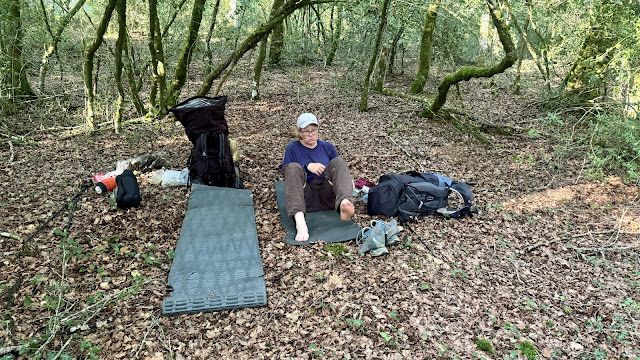 Als wir am nächsten Morgen um 5:30 aufwachen ist es noch dunkel, so dass ich erstmal Kaffee koche. Es ist hier auf 1300 Meter Höhe so warm, dass wir gleich im T-Shirt aufbrechen können. Während wir im Sonnenschein laufen, hängt weiter unten noch der Nebel. Weiter geht es im Hang über grüne Weiden. An einer Schaffarm helfen zwei Hunde die Pelzträger zum morgendlichen Melken zusammen zu treiben. Obwohl es noch früh ist, treibt uns ein Anstieg über 500 Höhenmeter den Schweiß aus allen Poren. Dann laufen wir einige Zeit einen Fahrweg abwärts, bevor wir in schönen Buchenwald eintauchen. Bei unserer Mittagspause treffen wir einen jungen französischen Wanderer der auch die HRP läuft. Der Atlantik in Hendaye ist nur noch 80 Kilometer, also etwa drei Wandertage entfernt. Wir verlassen diese Route allerdings jetzt, da wir durch die Berge weiter nach Westen zum Kantabrischen Gebirge wollen. Doch zunächst gelangen wir an der Grenze auf den Jakobsweg, Camino Frances, der im etwa 20 Kilometer entfernten Saint Jean Pied de Port begonnen hat. Die sehr gut markierte Route führt zunächst über den offenen Kanm, auf dem die Hänge von der Heideblüte teilweise violett gefärbt sind. Wir überholen zahlreiche Pilger, die meist an der hinten am Rucksack angebrachten Muschel als solche zu erkennen sind. Schließlich steigen wir lange durch den Buchenwald nach Roncevalles ab, einer großen historischen Anlage mit Kirchen, Pilgerherberge, Restaurants und Hotel. Anschließend laufen wir etwa zwei Kilometer weiter nach Auritz/ Burguete wo wir für die nächsten 4 Tage einkaufen und auf einer Bank unter schattigen Bäumen Brot, Köse, Obst und Schinken essen. Später geht es dann in einen Wald an einem Bach, wo wir abseits des Weges unser Cowboycamp aufschlagen. Als es dann gegen 22 Uhr zu regnen beginnt, stellen wir rechtzeitig unser Zelt auf, bevor wir nass werden.
